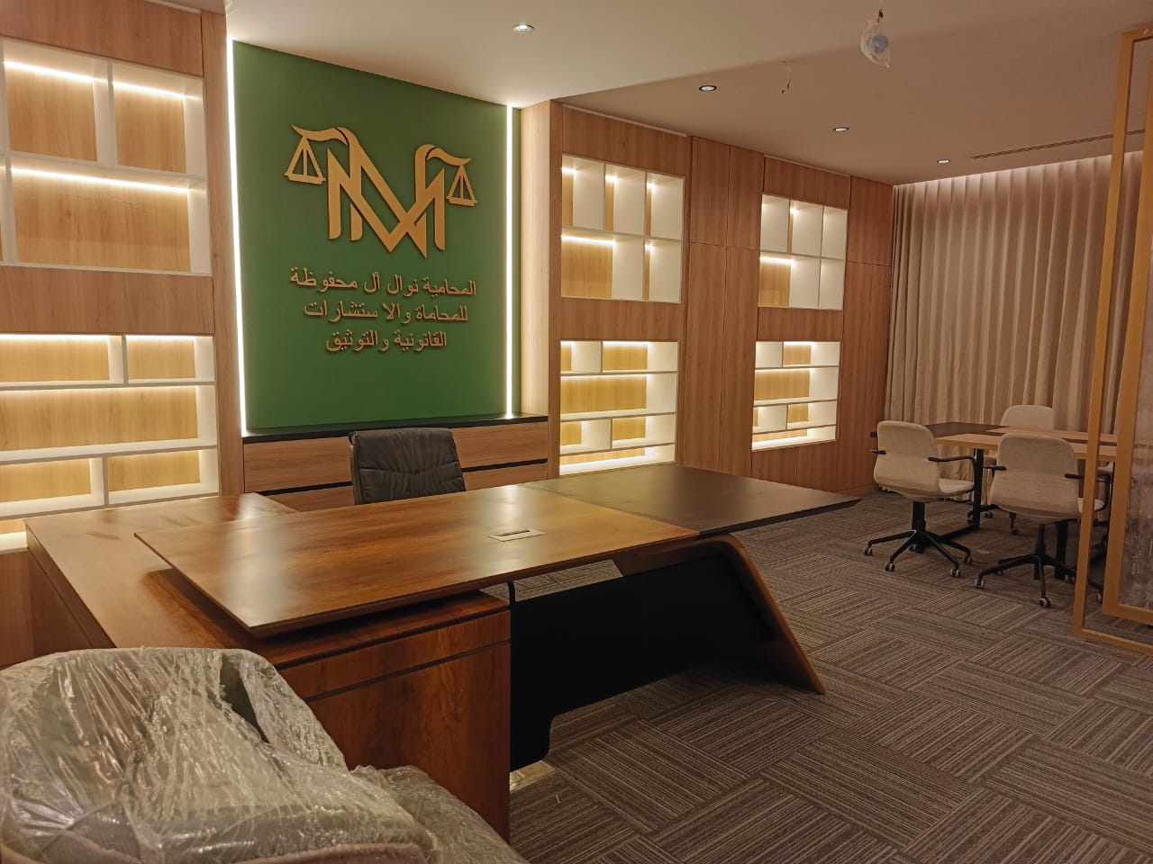 تنفيذ أعمال التصميم الداخلي والتشطيبات لمكتب محاماة بأسلوب عصري راقٍ يعكس الطابع الرسمي والمهني للمك...